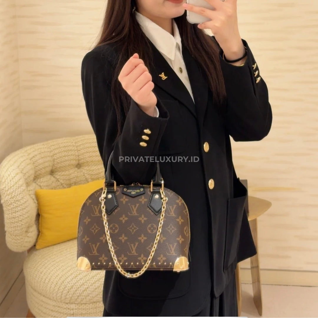 ASK VIA WHATSAPP JOIN TELEGRAMThe Alma BB is reimagined as part of the Trunk family, paying tribute to the House's travel heritage with iconic signatures. It is crafted from signature Monogram canvas, trimmed with black leather and gold-toned metallic corners and studs for an elevated finish. This edition is adorned with a removable chain and can be styled with or without the adjustable strap.