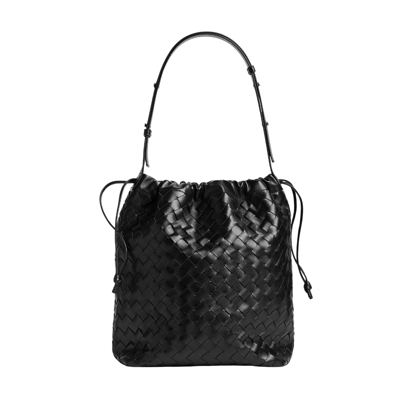 • Intrecciato leather bucket bag with drawstring closure and adjustable shoulder strap