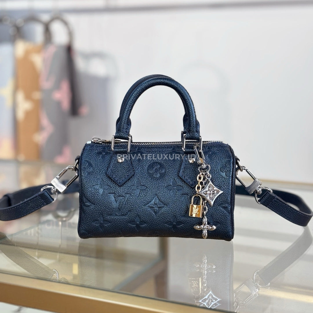 ASK VIA WHATSAPP JOIN TELEGRAMThis Shimmery edition of the Nano Speedy complements day and evening looks, thanks to its versatile colorway. Made from signature Monogram Empreinte leather, it is embellished with a removable charm showcasing Louis Vuitton signatures, including a padlock and Monogram Flower. Inside, there is enough room to store daily essentials, including a compact wallet.