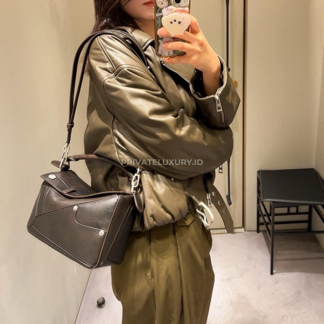 ASK VIA WHATSAPP JOIN TELEGRAMThe Puzzle is defined by its distinctive geometric lines and its cuboid form. This small version is crafted in shiny calfskin with denim trousers-inspired details.